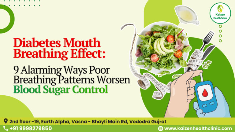 Diabetes Mouth Breathing Effect: 9 Alarming Ways Poor Breathing Patterns Worsen Blood Sugar Control ✔ Table of Contents Diabetes Mouth Breathing Effect: 9 Alarming Ways Poor Breathing Patterns Worsen Blood Sugar Control You focus on food.You focus on steps.You focus on medicines. But almost no one asks this critical question: How are you breathing — all day and all night? Breathing is automatic, so it’s ignored.Yet your breathing pattern directly controls oxygen delivery, stress hormones, nitric oxide, sleep quality, and insulin sensitivity. Welcome to the Diabetes Mouth Breathing Effect — a silent but powerful driver of insulin resistance that most diabetics have never been taught about. 1. What Is the Diabetes Mouth Breathing Effect? The Diabetes Mouth Breathing Effect refers to the metabolic consequences of chronic mouth breathing, including: Mouth breathing isn’t just a bad habit. It’s a physiological stress signal. 2. Why Breathing Style Affects Blood Sugar Your cells need oxygen to use glucose efficiently. When oxygen delivery is poor: Breathing controls: Poor breathing = poor glucose utilisation. 3. Mouth Breathing vs Nose Breathing: The Metabolic Difference Mouth Breathing Nose Breathing Your metabolism functions best in a calm nervous system, not a stressed one. 4. Nitric Oxide, Oxygen & Insulin Sensitivity Nose breathing produces nitric oxide (NO). Nitric oxide: Mouth breathing bypasses this mechanism entirely. Low nitric oxide = poor glucose delivery to muscles. 5. How Mouth Breathing Raises Cortisol Mouth breathing signals: Your brain responds by releasing cortisol. Cortisol: This means even without eating, mouth breathing can push …