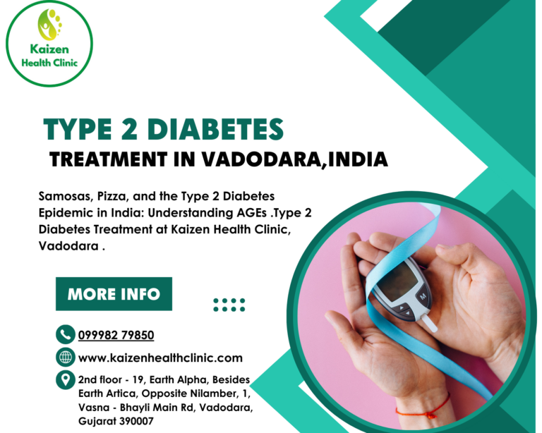 Type 2 Diabetes Epidemic Treatment in Vadodara ,India Table of Contents Samosas, Pizza, and the Type 2 Diabetes Epidemic in Vadodara, India: Understanding AGEs India is facing a growing Type 2 diabetes epidemic, and dietary habits are a major contributor. Foods like samosas, pizza, and other high-calorie processed snacks are fueling this crisis. One hidden culprit is advanced glycation end products (AGEs)—harmful compounds that can worsen insulin resistance and lead to chronic conditions like diabetes. In this blog, we’ll explore the connection between AGEs, modern food choices, and the rising diabetes epidemic in India, and share practical tips to reverse the trend. What Are Advanced Glycation End Products (AGEs)? AGEs and Their Impact on Health AGEs are harmful compounds formed during high-heat cooking methods such as frying, baking, and grilling. Foods rich in fats, proteins, and sugar—like samosas and pizza—are often loaded with AGEs. When consumed regularly, AGEs: Promote inflammation and oxidative stress. Worsen insulin resistance, a key driver of Type 2 diabetes. Accelerate complications in chronic conditions like diabetes and obesity. The Role of Indian Foods in Diabetes Samosas: The Hidden Risk Samosas are a deep-fried staple in India, but their combination of refined flour, oil, and high-heat cooking makes them: High in glycemic load, causing sharp blood sugar spikes. Rich in AGEs, contributing to chronic inflammation and insulin resistance. Pizza: A Double Threat Pizza, a modern favorite, is another AGE-rich food that: Combines refined flour, processed cheese, and sugary toppings, all of which worsen diabetes risk. Lacks fiber …